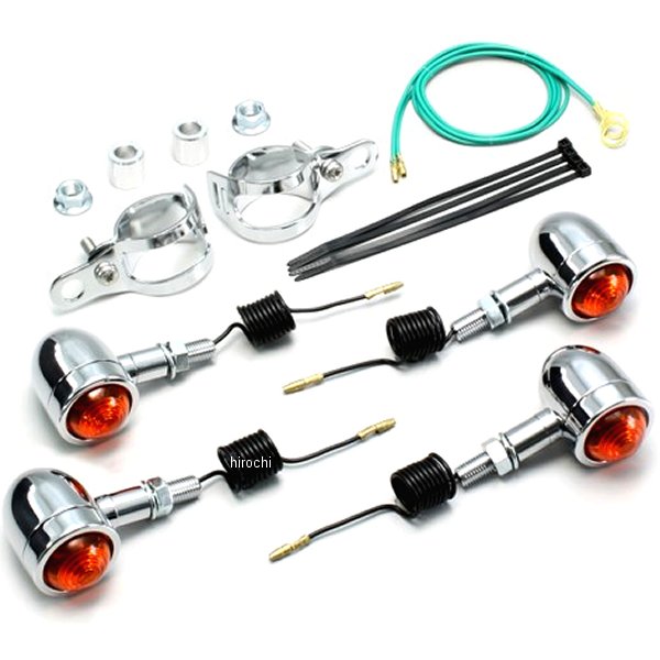 ハリケーン ミニブレットウインカー00年-17年 ヤマハ ドラッグスター 250フロント:フォークマウント取り付けリア:ノーマル位置取り付けウインカーサイズ:外径φ37mm材質:アルミ製クロームメッキ【セット内容】オレンジレンズにクリア球組込み(12V23W)×4個※シングル球のみ※ハリケーン製ウインカーは保安基準による正面から見た灯光部の面積7cm2以上の規定をクリアしています。【特徴】ミニブレットウィンカーはレンズの止めビスがないシンプルな形状です。