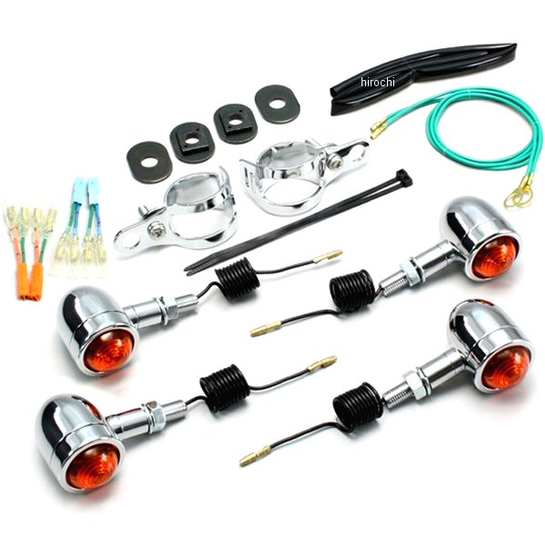 ハリケーン ミニブレットウインカー04年-08年 ホンダ シャドウスラッシャー400フロント:フォークマウント取り付けリア:ノーマル位置取り付けウインカーサイズ:外径φ37mm材質:アルミ製クロームメッキ【セット内容】オレンジレンズにクリア球組込み(12V15W)×4個※シングル球のみ※カプラ接続対応ジョイントハーネス付き。※ハリケーン製ウインカーは保安基準による正面から見た灯光部の面積7cm2以上の規定をクリアしています。【特徴】ミニブレットウィンカーはレンズの止めビスがないシンプルな形状です。