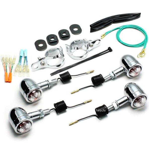 ハリケーン ミニブレットウインカー04年-08年 ホンダ シャドウスラッシャー400フロント:フォークマウント取り付けリア:ノーマル位置取り付けウインカーサイズ:外径φ37mm材質:アルミ製クロームメッキ【セット内容】クリアレンズにオレンジ球組込み(12V15W)×4個※シングル球のみ※カプラ接続対応ジョイントハーネス付き。※ハリケーン製ウインカーは保安基準による正面から見た灯光部の面積7cm2以上の規定をクリアしています。【特徴】ミニブレットウィンカーはレンズの止めビスがないシンプルな形状です。