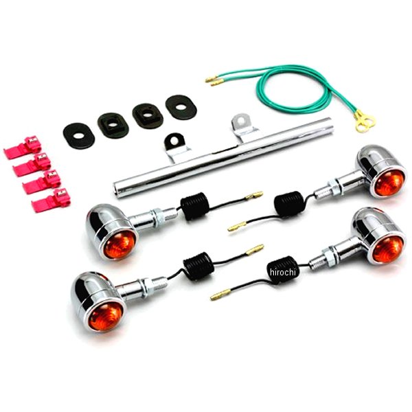 ハリケーン ミニブレットウインカー88年-98年 ホンダ スティード600 VLX88年-98年 ホンダ スティード400 VLX/VCLスチール製ステムマウントステーウインカーサイズ:外径φ37mm材質:アルミ製クロームメッキ【セット内容】取付ボルト(M10×P1.25)オレンジレンズ組込球(12V23W)×4個※シングル球のためポジションは使用できません。※ハリケーン製ウインカーは保安基準による正面から見た灯光部の面積7cm2以上の規定をクリアしています。【特徴】ミニブレットウィンカーはレンズの止めビスがないシンプルな形状です。