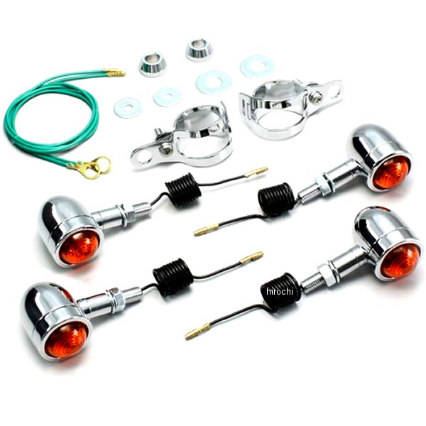 ハリケーン ミニブレットウインカー98年-07年 カワサキ エリミネーター250Vフロント:フォークマウント取り付けリア:ノーマル位置取り付けウインカーサイズ:外径φ37mm材質:アルミ製クロームメッキ【セット内容】オレンジレンズにクリア球組込み(12V15W)×4個※取付バンド付き。※シングル球のみ※ハリケーン製ウインカーは保安基準による正面から見た灯光部の面積7cm2以上の規定をクリアしています。【特徴】ミニブレットウィンカーはレンズの止めビスがないシンプルな形状です。