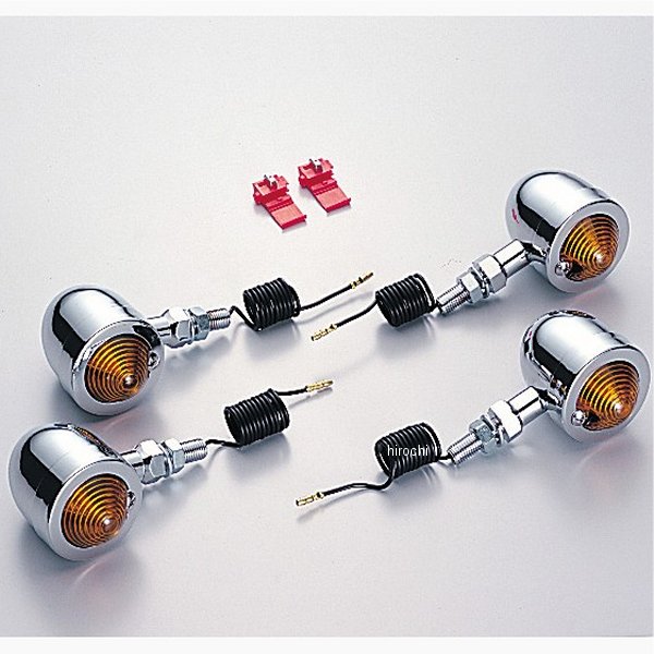 ハリケーン ブレットウインカーキット86年-99年 ホンダ ジャズフロント:ノーマルステー取り付けリア:主にノーマル位置取り付けウインカーサイズ:φ50mm材質:スチール製クロームメッキ【セット内容】オレンジレンズにクリア球組込み(6V10W) 計4個取付ボルト M10×P1.25※シングル球※ハリケーン製ウインカーは保安基準による正面から見た灯光部の面積7cm2以上の規定をクリアしています。