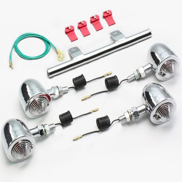 ハリケーン ブレットウインカーキット86年-99年 ホンダ ジャズフロント:ステムマウント(パイプステー式)取り付けリア:主にノーマル位置取り付けウインカーサイズ:φ50mm材質:スチール製クロームメッキ【セット内容】オレンジクリアにクリア球組込み(6V10W) 計4個取付ボルト M10×P1.25※シングル球※ハリケーン製ウインカーは保安基準による正面から見た灯光部の面積7cm2以上の規定をクリアしています。