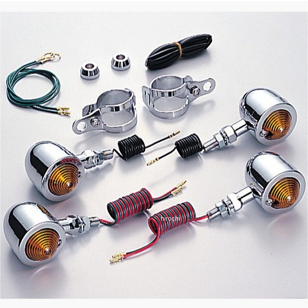 ハリケーン ブレットウインカーキット98年-07年 カワサキ エリミネーター250V90年-93年 カワサキ バルカン95年-98年 カワサキ バルカン95年-98年 カワサキ バルカン295年-97年 カワサキ バルカン800フロント:フォークマウント取り付けリア:主にノーマル位置取り付けウインカーサイズ:φ50mm材質:スチール製クロームメッキ【セット内容】オレンジレンズにクリア球組込み(フロント 12V23W/8W/リア 12V23W) 計4個取付ボルト M10×P1.25※シングル球/ダブル球※ハリケーン製ウインカーは保安基準による正面から見た灯光部の面積7cm2以上の規定をクリアしています。