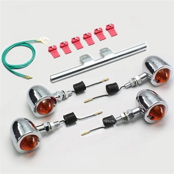 ハリケーン ブレットウインカーキット96年-99年 ホンダ ジョーカー96年-99年 ホンダ ジョーカー90フロント:ステムマウント取り付けリア:主にノーマル位置取り付けウインカーサイズ:φ50mm材質:スチール製クロームメッキ【セット内容】オレンジレンズにクリア球組込み(12V10W) 計4個取付ボルト M10×P1.25※シングル球※ハリケーン製ウインカーは保安基準による正面から見た灯光部の面積7cm2以上の規定をクリアしています。