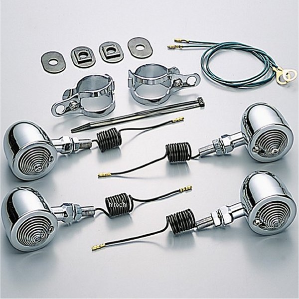 ハリケーン ブレットウインカーキット00年-08年 ホンダ シャドウスラッシャー400フロント:フォークマウント取り付けリア:主にノーマル位置取り付けウインカーサイズ:φ50mm材質:スチール製クロームメッキ【セット内容】クリアレンズにオレンジ球組込み(12V15W) 計4個取付ボルト M10×P1.25※シングル球※ハリケーン製ウインカーは保安基準による正面から見た灯光部の面積7cm2以上の規定をクリアしています。