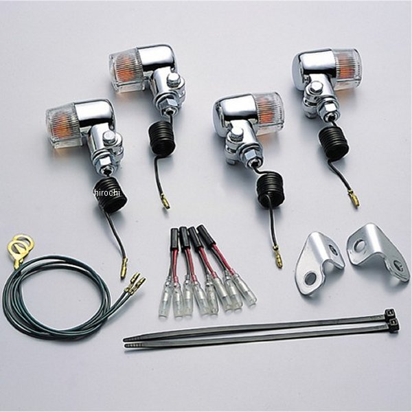 ハリケーン ミニウインカーキット02年-13年 カワサキ 250TRウインカーサイズ:φ35mm材質:アルミ製クロームメッキステム、アンダー取付ステー、カプラ接続対応ジョイントハーネス付き取付ボルト M10×P1.25クリアレンズにオレンジ球組込み(12V23W)×4個※シングル球のみ※ハリケーン製ウインカーは保安基準による正面から見た灯光部の面積7cm2以上の規定をクリアしています。
