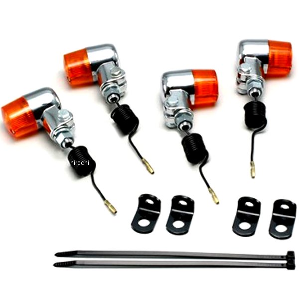 ハリケーン ミニウインカーキット02年-03年 ホンダ バイトウインカーサイズ:φ35mm材質:アルミ製クロームメッキフロント/リアステー付き取付ボルト M10×P1.25オレンジレンズにクリア球組込み(12V10W)×4個※シングル球のみノーマル位置取り付け※ハリケーン製ウインカーは保安基準による正面から見た灯光部の面積7cm2以上の規定をクリアしています。