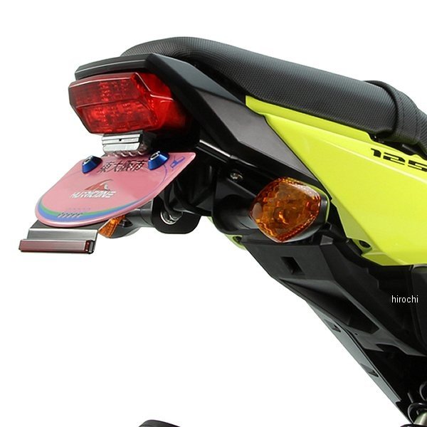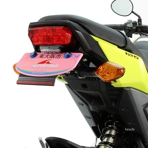 ハリケーン フェンダーレスキット16年 ホンダ グロムMSX125SFカラー:黒素材:アルミ製(ベースプレート)ボルトオン別途リフレクターが必要サイドまでカバーした形状ナンバー角度は現行基準に合わせた45度に設定しています。新基準適応のH33.4.1以降新規登録車両はご注意ください。ノーマルウインカー使用可
