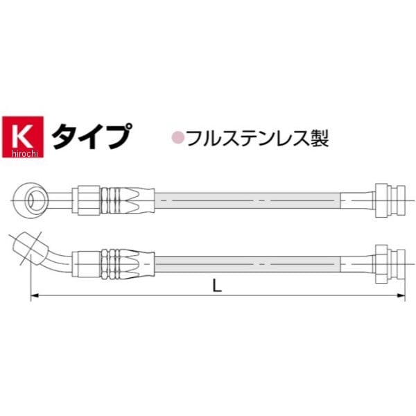 ハリケーン ブレーキホース SURE SYSTEM LINE長さ:40cmフルステンレス製Kタイプブレーキホース用車検対応品付属品:ガスケット×2、タイラップ1本売り【特徴】耐蝕性に優れたステンレス素材からの美しい削り出し。ホース部分はテフロンチューブをステンレスメッシュで補強し、PCVクリアコーティングを処した低膨張率ブレーキホースで、鋭く、しかも繊細なブレーキタッチを実現。信頼性の高い確実な制動力がライディングの幅を広げ、安全性を一段と向上させます。フィッティングとステンレスメッシュホースの接合部は信頼性の高いスェージング式カシメタイプを採用。厳重な耐圧テストによるオイル漏れ検査をクリアした車検対応品で、安心してご使用いただけます。バンジョーは上下共にアジャスタブルフィッティング式で、ハンドルバーの交換に伴うネジリ角度の変更にも自由に対応できます。