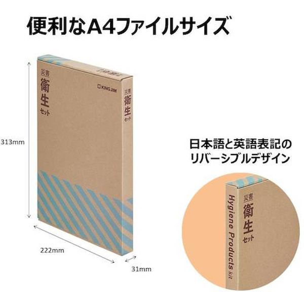 ・A4ファイルサイズでコンパクトな備蓄が可能な災害対策備蓄のセットです。・シンプルなパッケージデザインで、様々なオフィス・家庭にも馴染みます。・一人一つ分で個別管理が出来るために、災害担当者がテレワーク等で不在でも、誰でもすぐに使用できます。・衛生用品に特化した、安心してオフィス滞在できるセット・大判おしぼり(からだ拭き)、歯磨きシート、ドライシャンプーなどの衛生用品を同梱したセットです。・突然一晩オフィスに待機しなければならなくなった時、これらの衛生用品があることで、快適に過ごすことが可能です。・A4ファイルサイズでコンパクトな備蓄が可能な災害対策備蓄用。・【外形寸法】約W31×D222×H313 mm パッケージは変更となる場合がございます・【セット内容】1.大判おしぼり(からだ拭き)-3 個・2.ドライシャンプー( 2 枚入)-1 袋・3.歯磨きシート(5 包入)-1 袋・4.非常用簡易トイレ( 汚物収納袋+抗菌性凝固剤)-3 個・5ポケットティッシュ-1 個・6.使い捨てフェイスタオル-1 枚・7.不織布スリッパ-1 足・8.マスク-1 枚 ※マスク・不織布スリッパは個包装されています。・生産国 日本・JANコード 4971660778676・質量 410g・コード:339-8244 ・品目:HGS200