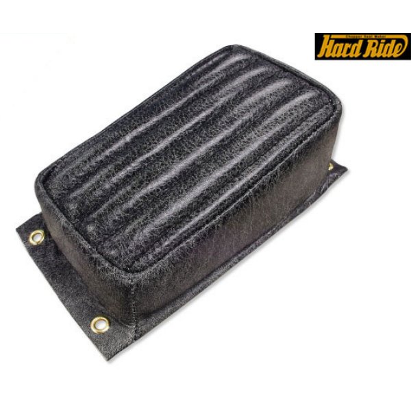 HR-014 ガッツクローム HARD RIDE サバイバーレザーリアパッド タックロール東京杉並HARD RIDE製「サバイバー」レザーリアパッドです。従来のブラックレザーとひと味違い、長い年月が過ぎ、革がひび割れたような表面加工が施されたレザーを使用しております。あくまでも表面加工なので、感触は従来品と同じくやわらかいレザーとなっております。もちろんこちらも本革を使用しておりますので乗るほどにさらにビンテージの質感は増し、体の一部の様に車体に馴染んでいきます。中身にもこだわり、柔らかすぎないウレタンはしっかりとしたホールド感で長旅の疲れを緩和します。サイズ縦約23cm×横約12cm固定穴位置:横約9cm、縦約21cm※多少の誤差はあります。