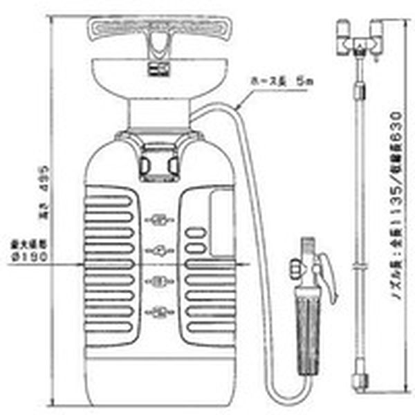 ・蓄圧式噴霧器です。・園芸消毒用に使用できます。・園芸、消毒用。・庭木の殺虫・殺菌・消毒剤の散布に。・容量(L):5・ノズル:二頭口・ノズル長さ(mm):630~1135・ホース長さ(m):5・ロングノズル・2頭口・タンク:ポリエチレン(PE)・生産国 日本・JANコード 4971770401952・質量 2.6kg