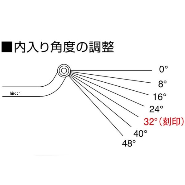 ハリケーン アジャスト ハンドル TYPE-107年-17年 カワサキ エストレヤ86年-04年 ホンダ フュージョン94年-96年 ホンダ フュージョンSE05年-07年 ホンダ フュージョンSE03年-07年 ホンダ フュージョンTypeX外径φ22.2mm 内径φ17.6mm ホルダー部取付幅120mm汎用タイプ 絞り角8°タレ角、前後48mmオフセット調整可能スチール製クロームメッキ汎用サイドキャップ※ハンドルスイッチ穴開け加工が必要です。※汎用サイドキャップはハンドル内径がφ17.6mmの為、インサート軸付(HB0302/HB0307)、ウエイトバランサー、ハンドル延長バーは取付できません。※記載車輌はケーブル、ホール類はノーマルのままで取付可能。 サイドキャップはインサート軸なしが適合。フュージョン/TypeX/XX/SE(07年以前)オフセット後向(06年以前)はセッター(HB0601C)が必要です。エストレヤ FI(07年-16年)オフセット前向 絞角を浅め調整。【特徴】調整範囲の広い可変ハンドル。シーンに合わせて手軽にポジションを変更できます。・内入り角度の調整ハリケーンセパレートハンドルで実績のあるセレーション加工により8度きざみで内入り角度が調整できます。角度の目安となる刻印を合わせた位置は内入り角32度になります。安全に操作が出来るように内入り角度は48度以下に設定してください。また、センターバーの前後の向きを変えることによってもポジション変更できます。