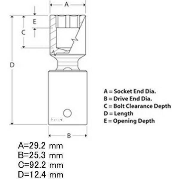スイベル ディープ メトリック インパクト ソケットです。サイズ:21mmソケットエンド直径(A): 29.2インチドライブエンド直径(B):25.3インチ長さ(D):92.2インチ開口深さ(E):12.4インチ形式:6ポイント※商品お届け時期につきまして、通常は一か月半前後となっておりますが仕入れ先の出荷状況により、お時間を頂戴する場合がございます。※商品手配後に、供給不可となる場合がございます。あらかじめご了承のうえご注文ください。