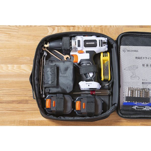 ・軽量でハイパワーのソフトケース付き充電式ドライバドリルです。・DIY初心者の方におすすめです。・スピード調整機能で低速と高速の2段階に切り替えが可能です。・クラッチ機能が13段階で、トルク(締め付け力)の調整ができるので、素材が割れるのを防ぎます。・フィット感のあるグリップで手が疲れにくい設計です。・バッテリー2個付属なので、片方は充電することができ使いたい時に使えます。・家具の組立、DIYに。・無負荷回転数(min[[の-1乗]])高速:0~1300・無負荷回転数(min[[の-1乗]])低速:0~350・バッテリー電圧(V):10.8・色:ホワイト・最大トルク(N・m):28・バッテリー容量(Ah):1500m・最大チャック把握径:10mm・ドライバドリル:ポリプロピレン、グラスファイバー(GF30)・ソフトケース:ポリエステル、ポリプロピレン・充電式リチウムイオン電池×2・ACアダプター・充電器・ビットセット(10種)・生産国 中国・JANコード 4967576631815・質量 830g・コード:446-3300 ・品目:JCD28C