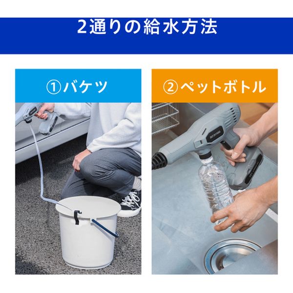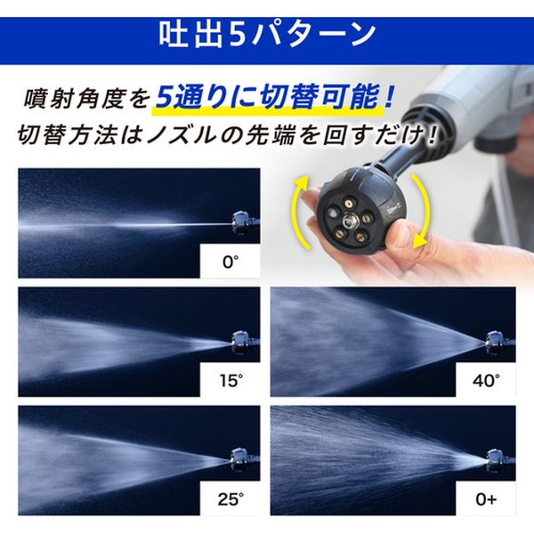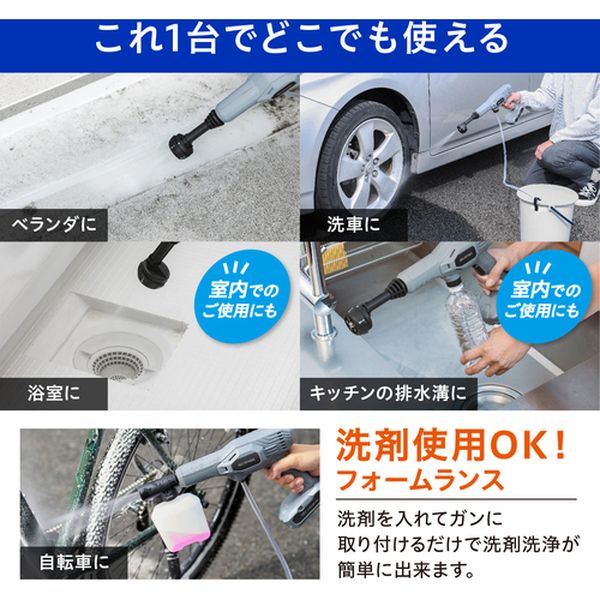 ・手軽に使えて疲れにくい軽量タイプです。・コンパクトだから使い勝手がよく、室内でも使いやすい充電式ハンディウォッシャーです。・充電式なので、電源なしでベランダ・浴室・キッチンの排水溝や自転車など屋内外で使用できます。・2つの使用パターンがあります。・5in1ノズル使用はノズルを回転させると水の出かたを噴射角度0°15°25°40°0+(シャワー)の5通りに切り替え可能です。・フォームランス使用は専用タンクに洗剤を入れると泡を噴射できます。・バケツ(水をためられるもの)を準備して、付属のホース用フィルター、ホース(長)、ホース固定用クリップを取り付けた状態で使用します。・または、ペットボトルを使う場合は500mlペットボトルにホース(短)を取り付け使用します。・バッテリーの充電は市販のACアダプターに付属のUSB充電ケーブルを接続し充電します。・充電中はバッテリーランプが赤色に点灯、充電が完了すると緑色に点灯します。・清掃に。・吐出水量(L/min):2.5・吐出圧力(MPa):1.4・幅(mm):247・奥行(mm):72・高さ(mm):226・電源(V):単相100・電源コード長さ(m):約1・充電時間:約2時間(ACアダプターが5V/3Aの場合)・連続使用時間(h):約15分・給水方式:バケツ・ペットボトル・ホース長さ(m):ホース短:約0.2、ホース長:約5・充電入力:DC5V、2A以上推奨・ポリプロピレン、ABS樹脂・5in1ノズル、フォームランス、ホース固定用クリップ、・ホース短(約0.2m)、ホース長(約5m)、ホース用フィルター、USB充電ケーブル(約1m)・生産国 中国・JANコード 4967576690584・質量 900g・コード:633-1458 ・品目:JHW101H