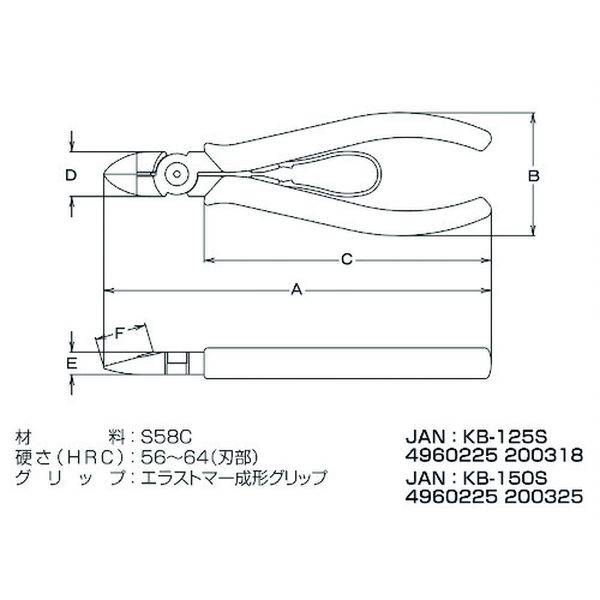 ・薄い刃先で結束バンドや配線、厚い刃元で鉄線の切断が可能です。・刃に段差がつけてあるので、結束バンドを切る際に切り損じにくいです。・かるいニッパ(LN-150S)をベースとしている為、超軽量です。・手になじみやすいエラストマー樹脂グリップを採用しています。・連続作業が楽なプラスチックバネ付(バネは取り外し可能)です。・配線の結束/自動車整備/機器の組み立て/設備メンテナンス等。・全長(mm):164・刃表面形状:ラウンド刃・切断能力(mm)VA線・VVF線:φ1.6(2芯)・切断能力(mm)より線:φ2・切断能力(mm)鉄線:φ1.9(刃元)・切断能力(mm)銅線:φ2.6(刃先)、φ3.2(刃元)・ばね:有(プラスチックバネ)・結束バンド対応幅(mm):9・落下防止用ひも取付穴:無・ハンドル:エラストマー樹脂・刃元(mm):5・刃先(mm):15・刃先で結束バンド幅9.0mm、刃元で鉄線φ1.9mmまで切断可能・寸法(mm)A=164/B=52/C=122/D=19/E=9.5/F=20・本体:S58C・絶対に電気を通さないで下さい。非絶縁工具です。・ハンマーがわりに使用しないでください。・使用範囲をこえての使用はしないでください。・生産国 日本・JANコード 4960225200325・質量 120g・コード:126-7911 ・品目:KB150S