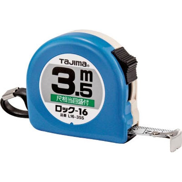 ・尺相当目盛付です。・テープを固定できる、ロックタイプです。・ケース裏面は鉛筆でメモが書けます。・一般測定用コンベックス。・テープ長さ(m):3.5・テープ幅(mm):16・水平保持(m):1.5・目盛仕様:尺相当目盛・爪仕様:移動爪・0点補正移動爪:○・455ピッチ表示:○・ショックアブソーバー:あり・色:青・テープ色:白・ショックアブソーバー付:○・ヨンゴーゴーピッチ表示:○・JIS1級・ロックタイプ・移動爪・ブリスターパック入・ベルトクリップなし・片面目盛・減速ボタン:なし・テープ:スチール・本製品には通電性があります。感電に注意して下さい。・テープのエッジで手を切る恐れがありますので、手袋を着用して下さい。・生産国 中国・JANコード 4975364010414・質量 124g・コード:377-1741 ・品目:L1635SBL