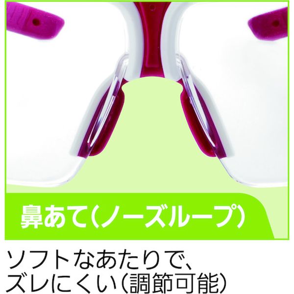 ・メタルフリーで、軽量・長寿命・安全です。・ブリッジ、鼻当て、テンプル、耳当てが顔の形に合わせて快適にフィットします。・半面形面体(防じんマスク、防毒マスク)との併用ができます。・ヒンジの角度が5段階調節可能です。・一般作業(飛来物等)・レンズ色:クリア・テンプル色:ホワイト/マゼンタ・フレーム色:ホワイト/マゼンタ・レンズ厚(mm):2.2・防曇加工:○・防傷加工:○・UVカット:○・角度調整:○・ノーズパッド:○・JIS T 8147:2016適合品・EN 166:2001 クラス1適合品・UV400カット(400nmまでの紫外線を100%カット)・曇り止め加工・表面硬化・レンズ:PC(ポリカーボネート)・フレーム:TPU(熱可塑性ポリウレタン)、TPE(熱可塑性エラストマー)・鼻あて:TPE(熱可塑性エラストマー)・生産国 ドイツ・JANコード 4959382073422・質量 30g・コード:359-0456 ・品目:LX52