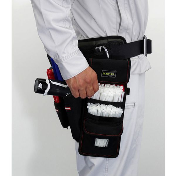 ・3サイズ収納できる3段式ホルダーです。・持ち運び時はフタを閉じ、作業時はフタをマジックテープで止めておくことができます。・フタの先端(5cm)生地の内側に樹脂板を入れている為、前にたれてこず、作業性が上がります。・ポケット位置を取り出しやすい高さのバランスで考えているので作業性が良いです。・装着はベルト通しとカラビナの2方法からお選び頂けます。・100mmのポケットには取り出し口付です。・3サイズのケーブルタイの収納、持ち運びに。・色:黒・形状:3段式・幅(mm):125・奥行(mm):40・高さ(mm):230・ベルト通し幅(mm):70・収納ケーブルタイサイズ(mm):100、150、200・カラビナ取付位置:1個・本体生地、フチ巻きテープ:ポリエステル(PE)・カラビナ:アルミ・カラビナ1個・生産国 中国・JANコード 4992456203707・質量 160g・コード:148-7111 ・品目:MCH200