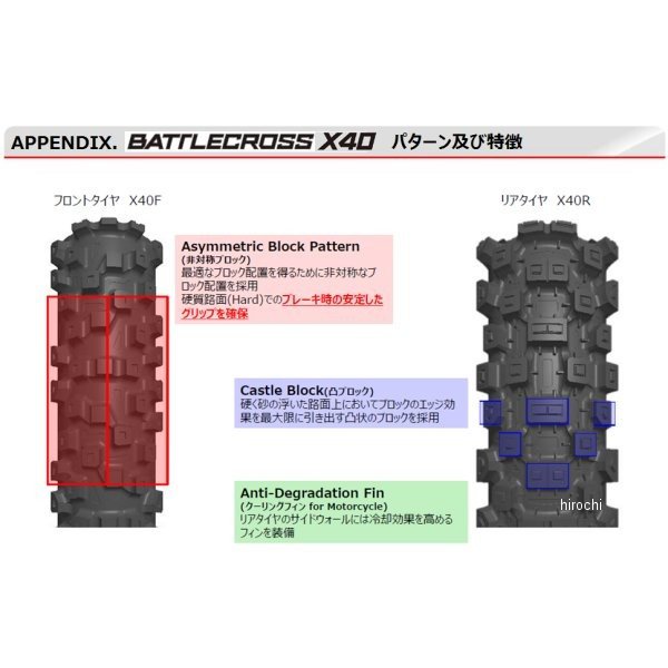 ブリヂストン BRIDGESTONE BATTLECROSS X40用途:リア用リム径:19インチチューブタイプ標準リム幅(インチ):2.15偏平率:80%構造:バイアス荷重指数:63(272kg)速度記号:M(130km/h)一本売り【バトルクロス特徴】レースの現場で開発され、更なる性能進化を遂げた