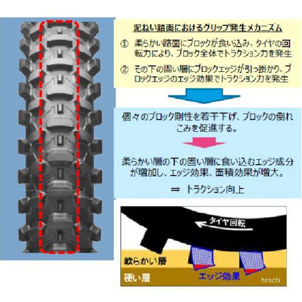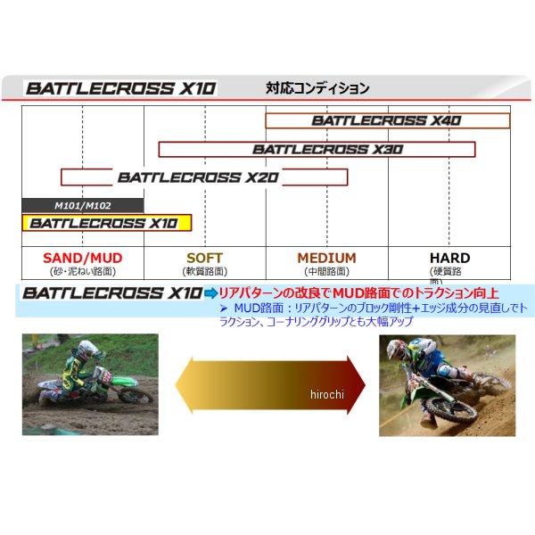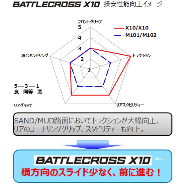 ブリヂストン BRIDGESTONE BATTLECROSS X10用途:フロント用リム径:21インチチューブタイプ標準リム幅(インチ):1.85許容リム幅(インチ):1.60-2.15偏平率:100%構造:バイアス荷重指数:51(195kg)速度記号:M(130km/h)一本売り【バトルクロス特徴】レースの現場で開発され、更なる性能進化を遂げた【代表車種】07年-17年 ヤマハ WR250R92年-93年 スズキ MX250S94年-95年 スズキ RMX250S00年 スズキ DR-Z400S01年-03年 スズキ DR-Z400S04年-08年 スズキ DR-Z400Sフロント用 21インチ標準リム幅 1.85インチ許容リム幅 1.60-2.15インチチューブタイヤ【仕様説明】リアパターンのブロック剛性+エッジの見直しでトラクション、コーナーリンググリップとも大幅アップ。ブロックの高さを通常より低くすることで泥はけ性を確保。また、タイヤ幅方向の泥の流れの抵抗となり、横滑りを抑制。(エッジアップ)横方向のスライド少なく前に進むことができます。※2/16発売の予定のため予約販売品となります。