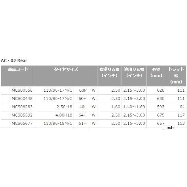 ブリヂストン BRIDGESTONE ACCOLADE AC02用途:リア用リム径:18インチチューブタイプ標準リム幅(インチ):2.50許容リム幅(インチ):2.15-3.00構造:バイアス荷重指数:64(280kg)速度記号:H(210km/h)一本売り【アーコレード AC02特徴】クラシカルバイクでの楽しい走りが味わえるパタン、機能が持ち味。トラディショナルなパタンと、先進のタイヤテクノロジーを高次元でバランスさせた高性能カスタムギア。ビンテージバイクでトラディショナルな外観を志向し、高いグリップ性能を求めるお客様に。バトラックスで培われたタイヤテクノロジーから生まれた、独自のコンパウンドを採用。高いグリップ性能と、耐摩耗性能を高次元で実現。トレッドセンター部に、リッジ付きリブパタンを採用。サイド部までまわり込んだパタンとともに、トラディショナルなイメージを演出し、シングルの雰囲気にあったスタイリングを実現。高いグリップ性能と、スムーズなハンドリングを実現するためにショルダー部に大ブロックパタンを採用。また、センター部の周方向グルーブやショルダー部の横方向グルーブで、ウェット性能も確保。深いバンク角でも、安定した接地面積を確保するクラウン形状を採用。ケース剛性の最適化により、ハンドリングや安定性を向上。【代表車種】83年-84年 ヤマハ SR40085年-87年 ヤマハ SR40088年-92年 ヤマハ SR40093年-00年 ヤマハ SR40083年-84年 ヤマハ SR50085年-87年 ヤマハ SR50088年-92年 ヤマハ SR50093年-96年 ヤマハ SR50097年-00年 ヤマハ SR50092年 ヤマハ SR500S70年 ヤマハ XS65080年-81年 ヤマハ TX650