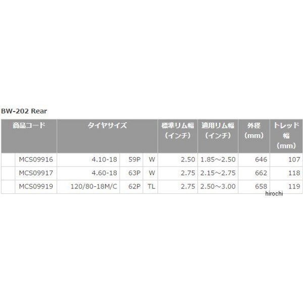 ブリヂストン BRIDGESTONE BATTLE WING BW202用途:リア用リム径:18インチチューブタイプ標準リム幅(インチ):2.75許容リム幅(インチ):2.15-2.75構造:バイアス荷重指数:63(272kg)速度記号:P(150km/h)一本売り【バトルウィング BW202特徴】オフロード車のオンロード使用専用パタン。このグリップは、このライフは、まさに街を駆ける新しい足。新次元のライフ、ハンドリングを生み出す優れたトータルバランス。オフロード車で高速を含むストリート走行や街乗りを主体とするお客様に。ストリート向けスリック調のパタンとON/OFFタイヤ並みの深溝の組み合わせにより、これまでのオフロード専用タイヤの常識を覆すロングライフを実現。また、形状・コンパウンドとも最適なセッティングを図る中で高速安定性能を獲得。【代表車種】97年-99年 ホンダ CRM25089年-93年 ホンダ CRM250R94年-96年 ホンダ CRM250R91年-98年 ホンダ XLR25087年-88年 ホンダ XLR250R89年-90年 ホンダ XLR250R88年-89年 ホンダ XLR250バハ90年-95年 ホンダ XLR250バハ91年-94年 ホンダ XLディグリー95年-98年 ホンダ XLディグリー95年-96年 ホンダ XR25097年-99年 ホンダ XR25000年-02年 ホンダ XR25003年-05年 ホンダ XR25006年-07年 ホンダ XR25095年-96年 ホンダ XR250バハ97年-99年 ホンダ XR250バハ00年-04年 ホンダ XR250バハ88年-90年 ヤマハ DT20084年 ヤマハ DT200RYSP91年-92年 ヤマハ DT200WR93年-96年 ヤマハ DT200WR93年-94年 ヤマハ TT250R95年-97年 ヤマハ TT250R94年 ヤマハ TT250R レイド95年 ヤマハ TT250R レイド96年-99年 ヤマハ TT250R レイド07年 ヤマハ TT-R25083年-88年 ヤマハ XT25097年-99年 ヤマハ ランツァ82年-83年 ヤマハ XT40083年-84年 ヤマハ XT600Z テネレ96年-98年 スズキ RMX250S89年-97年 スズキ TS200R95年-99年 スズキ DR250R00年 スズキ DR250R98年-99年 スズキ ジェベル250 GPS00年-03年 スズキ ジェベル250 GPS96年-99年 スズキ ジェベル250 XC00年-08年 スズキ ジェベル250 XC81年-82年 スズキ ハスラー25094年-99年 カワサキ KDX220SR98年-99年 カワサキ KLX25001年-07年 カワサキ KLX25008年-17年 カワサキ KLX25094年-97年 カワサキ KLX250ES93年-97年 カワサキ KLX250SR