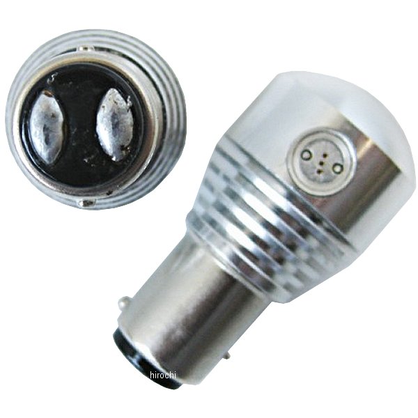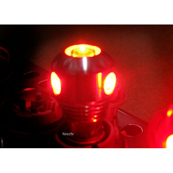 マッドマックス MAD MAX ハイパワーLEDバルブ S25全長:約50mm、幅約25mm、ピン角度180度 段違いピン発光色:レッド電圧:12V/24V兼用 ダブル球形状:S25(BAY15d)数量:2個入り世界でも名高い、CREE製の超高輝度 5WのLEDを前面に搭載(プロジェクターレンズ採用)。さらに側面の1.5WのLED3個搭載で360°照射、どんな角度も明るく照らします。高出力特有の発熱による問題も、アルミヒートシンクによる放熱効果で解消しました。