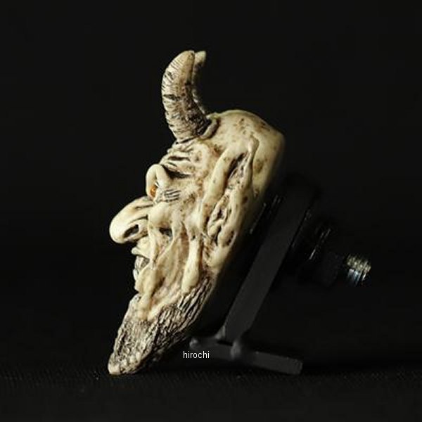 GOODS グッズ SATANISM ナンバーボルト Starvation Brownカラー:Starvation Brown素材:本体/レジン、ボルト/スチールサイズ:幅 37mm、高さ 57mm、奥行 24mm(ボルト含まず)、ボルト M6-20mm本体×1(左右ペアではございませんのでご注意ください)適合車種:汎用SATANをテーマに造形千年の終わり底知れぬ深み、獄から解放されるサタンは地の四方にいる連合体ゴグ、マゴグを惑わし、彼らを戦いのために召集する。獄炎の狼煙を上げ地を駆け巡るSATANIC RIDERSと、よりSATANそのものにフォーカスを当てたSATANISMナンバーボルトをラインナップ致しました。人々の心に抱く闇を見透かす鋭い眼光。地に落とされ強い恨みを持つ事により深く刻まれる幾多のしわ。狡猾さが滲み出る不敵な表情にこだわり、地獄の王の威厳を最大限に表現しました。SATANIC RIDERSではオリジナルゴーグルを制作。透明度の高いレンズにもこだわり、よりバイカーライクなナンバーボルトに。※SATANIC RIDERSのゴーグルの位置は固定されており、目元への装着は不可となります。予めご容赦ください。ひとつひとつを丁寧にPAINTを施し、量産では絶対に出せないリアルな質感を感じさせる一点モノ。各シワや目じりには表情をより強力なものにする墨入れを。いかにも邪悪な牙の一本一本にもエイジングを施しあくまでもオリジナルに。ヨハネの黙示録にも説かれる言い伝えをもとに忠実に再現致しました。Making&Monsters オリジナルのスカルプチャにM6のボルトを造形に埋め込み、ナンバーボルト化。ナンバープレートの割れを軽減する為に大きめのワッシャーを付属しております。