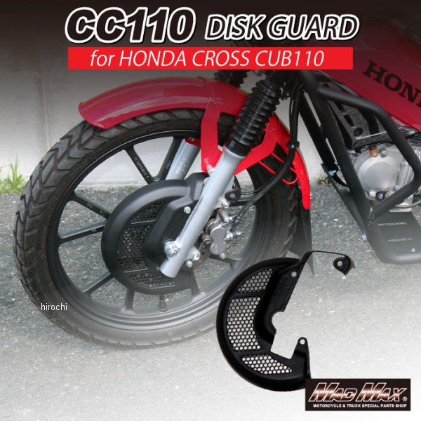 マッドマックス MAD MAX Mr Quick製 ディスクガードホンダ クロスカブ110(JA60)【仕様説明】丈夫なPP樹脂でできており、走行中の飛び石などからディスクをガードします。林道走行する場合などのディスクの保護におススメです。【注意事項】※撮影環境上、色調が異なる場合が御座いますので予めご了承下さい。※また生産ロットにより画像と比べ色が若干異なる場合がございます。予めご了承ください。※海外輸入品となりますので輸送の際の多少の小キズ等御座います。※本体を改造又は分解された場合に関しましては保証の対象外となります。予めご了承下さい。※取り付け中に生じた不具合に関しましては当社にて一切責任を負いかねますので予めご了承の上、よろしくお願いします。