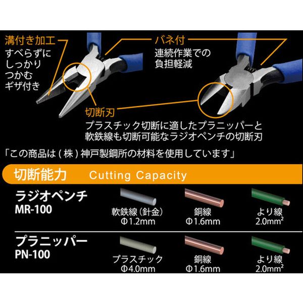 ・つかむ、曲げる、切るができる手のひらサイズの基本セットです。・切断能力(mm)軟鉄線:1.0・切断能力(mm)銅線:1.6・切断能力([[MM2]])より線:2.0・切断能力 MR-100:軟鉄線φ1.0mm、銅線φ1.6mm、より線φ2.0mm・切断能力 PN-100:銅線φ1.6mm、より線φ2.0mm、プラスチックφ3.0・機械構造用炭素鋼・グリップ:塩化ビニール・非絶縁工具です。電源を切ってお使い下さい。・使用用途以外には使用しないで下さい。・その他商品台紙注意事項参照してください。・生産国 日本・JANコード 4952269430141・質量 90g・コード:853-5017 ・品目:MRN100
