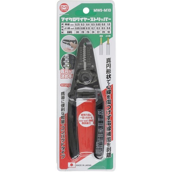 ・真円形状で芯線を傷つけず電線被覆をきれいに剥離します。・軽量、コンパクトタイプです。・安心の日本製です。・IV線、KV線・VSF線・VA線など各種絶縁電線、コード・ケーブルに対応・全長(mm):155・適合電線(mm):0.25、0.3、0.4、0.5、065、0.8、1.0・適合電線([[MM2]]):0.05、0.08、0.13、0.2、0.3、0.5、0.8・適合電線(AWG):30、28、26、24、22、20、18・適合電線:KV、KIV、IV、VSF、AVなどの細線・色:グリップ黒・グリップカラー:黒・炭素鋼・塩化ビニール・生産国 日本・JANコード 4992456207279・質量 100g・コード:148-7047 ・品目:MWSM10