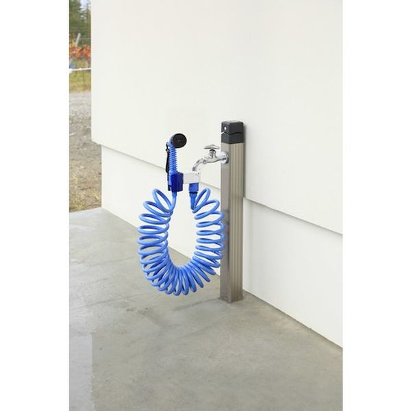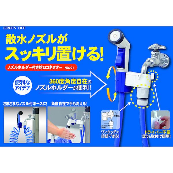 ・散水ノズルが置ける蛇口コネクターです。・散水ノズルをホルダーにセットすれば、手洗いもできます。・ノズルホルダーは360度回転するので、お好きな角度に調整できます。・蛇口への取付は工具不要のユリヤねじを採用してます。・高さ(mm):70・適合蛇口:丸型蛇口外径16mm・横水栓、万能ホーム水栓、自在水栓に適用・本体、ノズルホルダー:ABS樹脂・使用後はホース及び製品内の水を抜き、蛇口から取り外し、室内で保管下さい。・生産国 台湾・JANコード 4971715112431・質量 100g