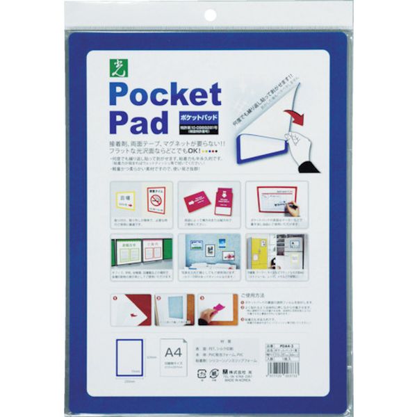 ・フラットな光沢面なら、接着剤・両面テープ・マグネットを使用せず繰り返し何度でも貼ってはがせます。・縦・横自由に使用できます。・取り付け・取り外しが簡単で、必要な時に合わせて使用できます。・印刷物・写真などの掲示。・色:青・縦(mm):323・横(mm):235・厚さ(mm):3.5・適合サイズ:A4・表面:ポリエチレンテレフタレート(PET)・本体:PVCフォーム・PVC・吸着部:シリコーンノンスリップフォーム・取り付ける場所の素材により多少の色移行、塗装がはがれたりする場合があります。・生産国 韓国・JANコード 4977720003733・質量 86g・コード:434-8001 ・品目:PDA43