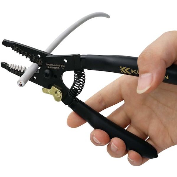 ・刃部は精密研磨のため、簡単に高精度なはく離が可能です。・グリップは強く握っても痛くならない軟質樹脂成形グリップを使用しています。・バネ付なので、連続作業が楽に行えます。・刃元部分で銅線の切断が可能です。・本体にAWG、mmの換算表示をしています。・通信機器・TV・AV・PC他、精密機器の電線のストリップ、切断に最適です。・全長(mm):167・適合電線(mm):単線φ0.8/1.0/1.3/1.6/2.0/2.6・適合電線([[MM2]]):より線0.3/0.5/0.8/1.3/2.0/3.5・適合電線(AWG):単線20/18/16/14/12/10 より線22/20/18/16/14/12・色:黒金・特殊鋼・本来の目的以外では使用しないでください。・作業時は周り安全を確かめてご使用ください。・保護メガネ等を着用して作業してください。・能力以上の使用はしないで下さい。・電気の流れている物への使用は絶対にしないで下さい。・生産国 台湾・JANコード 4952520083451・質量 120g・コード:368-2830 ・品目:PP323A165BG