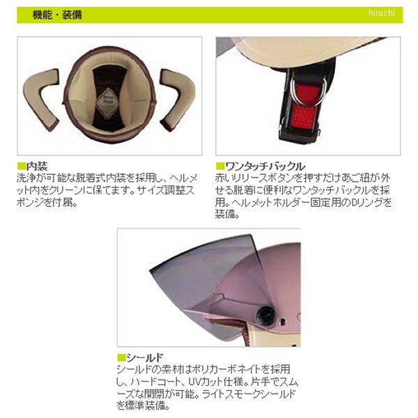 QJ-3 リード工業 ヘルメット ストリートアリス セミジェットジェットタイプカラー:パールピンクサイズ:レディース フリー (57cm-60cm未満)125cc以下用素材:ABS(帽体)、ポリカーボネイト(シールド)付属品:サイズ調整スポンジキュートなカラーを採用し、広々とした視界を確保したシールドは、スムーズな開閉感を実現。内装には通気性の良いメッシュ材を採用し、ヘルメット 内部にこもる熱やムレを低減します。洗浄が可能な脱着式内装を採用し、ヘルメット 内をクリーンに保てます。赤いリリースボタンを押すだけあご紐が外せる脱着に便利なワンタッチバックルを採用。ヘルメット ホルダー固定用のDリングを装備。シールドはハードコート、UVカット仕様。片手でスムーズな開閉が可能。ライトスモークシールドを標準装備。【規格】SG/PSC【届出事業者】株式会社リード工業【検査機関】一般財団法人製品安全協会
