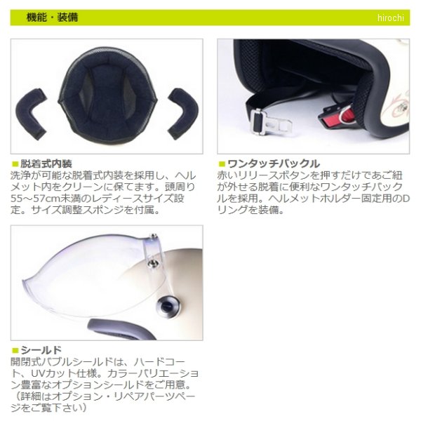 QP-2 リード工業 ヘルメット ストリートアリス スモールロージェットジェットタイプカラー:アフリカサイズ:レディース フリー (55cm-57cm未満)全排気量対応素材:ABS(帽体)、ポリカーボネイト(シールド)付属品:サイズ調整スポンジ女性に人気のスモールロージェットに開閉式バブルシールドを装備した可愛く機能的なヘルメット 。内装は洗浄が可能な脱着式を採用し、清潔で快適なバイクライフをサポート。豊富なカラーから選べる専用のオプションシールドをご用意。脱着に便利なワンタッチバックルを装備。【規格】SG/PSC【届出事業者】株式会社リード工業【検査機関】一般財団法人製品安全協会