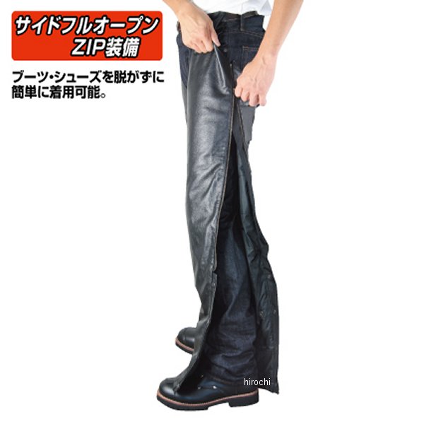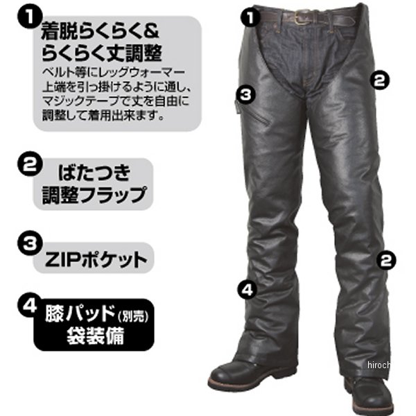 ラフ&ロード 秋冬モデル サイドジップレザーレッグウォーマーサイズ:スタンダードカラー:ブラック【素材】表地:牛革裏地:タフタキルト中綿:ウォームマックス【仕様説明】固定はベルト吊り下げ式でサイドファスナーはフルオープンが可能なので、ブーツを履いたまま脱ぎ履き可能な防護兼防寒チャップスです。表皮は牛革で高いプロテクション性をもち、裏側にはキルティング綿を採用してあり冬季での使用に最適。通勤通学からツーリングまで幅広く使える多才な用途を備えた新感覚防寒着です。携帯に便利な収納袋付き。また、膝裏にあるパッド袋に別売のパッドを入れる事で安全性を確保することが出来ます。