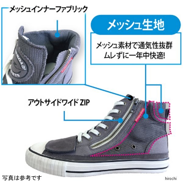 ラフ&ロード 春夏モデル ラフエアスルーRDスニーカーサイズ:23.0カラー:ブラック【素材】本体:メッシュ、キャンバス【仕様説明】目指したのはオンライドとオフライドの融合というチョット欲張りなスニーカーです。最大のセールスポイントはメイン素材をメッシュ生地にした通気性の良さで、 夏のライディングシーンを快適にします。ベースカラーは「ブラック」と「グレー」そして「ネイビー」の三色をラインナップ。機能も充実。斜めに大きく開くファスナーは脱ぎ履きしやすさ抜群、外側ファスナーなので車体を傷つける心配がいりません。踵にはリフレクターを付け視認性も確保。また、くるぶし内側に厚めのクッションを入れニーグリップをしやすくしています。左足に装備した大きめのシフトガードは、幅5.5センチとシフト場所の個人差にも余裕で対応。バイク用品メーカーがバイク乗りのために作ったスニーカーです!