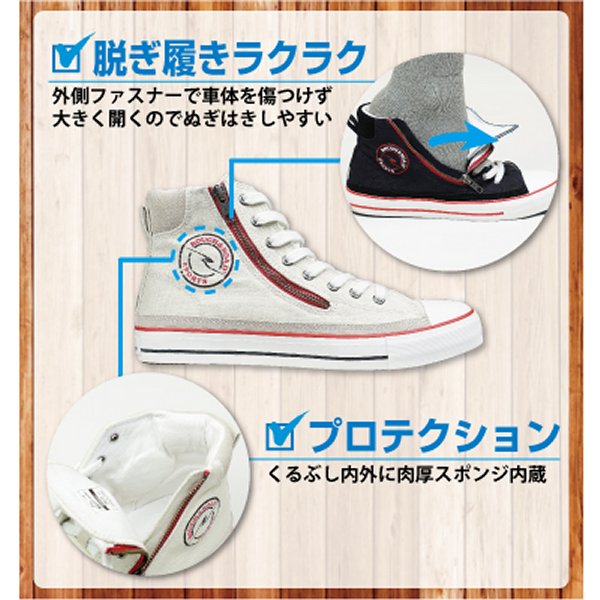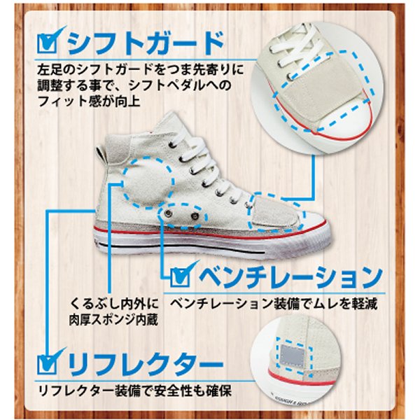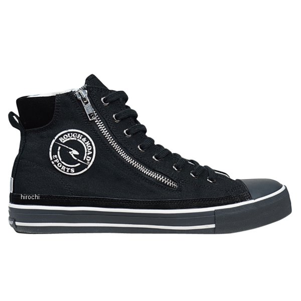 ラフ&ロード 秋冬モデル ラフライディングスニーカーサイズ:24.0cmカラー:ブラック98素材:キャンバス目指したのはライディングとファッションの融合というチョット欲張りなスニーカーです。ベースカラーは着まわししやすい「ブラック」と「アイボリー」の他に、足元が映える「グレー」「ワイン」「オリーブ」をラインナップ。機能も充実。斜めに大きく開くファスナーは脱ぎ履きしやすさ抜群、外側ファスナーなので車体を傷つける心配がいりません。踵にはリフレクターを付け視認性も確保。また、くるぶし内側に厚めのクッションを入れニーグリップをしやすくしています。左足に装備した大きめのシフトガードは幅5.5センチとシフト場所の個人差にも余裕で対応。バイク用品メーカーがバイク乗りのために作ったスニーカーです。【機能】・ジッパー仕様・くるぶしプロテクション(内外)・左足シフトガード・ベンチレーション・リフレクター