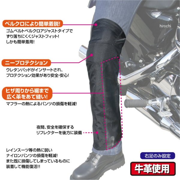 ラフ&ロード 春夏モデル ラフレザーヒートガード サイズ:スタンダード 全長約40cm(身長 H150-175cm)カラー:ブラック右足のみ【仕様説明】気付いたらマフラーでパンツを溶かしてしまった方、燃やしてしまった方は少なくないと思います。レインパンツやブーツカットのパンツをはいていると走行中や信号待ちで足を出したときに、意外と簡単に接触してしまうものですが、この製品を使えば裾のバタ付きを抑え、さらにマフラーの熱によるパンツの損傷や火傷を予防できます。ラップ式なので脱着も簡単、サイズのアジャストもしやすくなっています。※マフラー、エンジン等熱したものに密着した場合溶ける、縮む、燃える場合があります。
