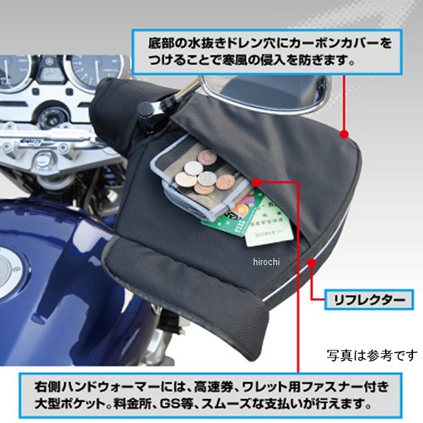 ラフ&ロード 秋冬モデル HOTハンドウォーマーサイズ:フリーサイズカラー:シティーカモ【素材】バリアクロス600D、バリスターナイロンクロス、PVC、PVCタフタ、圧縮ウレタン、クロロプレン【仕様説明】ハンドガード付のオフ車からネイキッド、ビッグスクーターまで※1幅広く対応するハンドウォーマー。装着時にも抜群の操作性を実現愛車に合わせてコーディネートしやすくなっています。裏地部分には防水フィルムを入れ、入り口部分にシャーリングを設けることで雨水の浸入を抑えた簡易防水仕様となっています。※1 車両タイプ、ハンドガードの大きさによってはつかないことがあります。