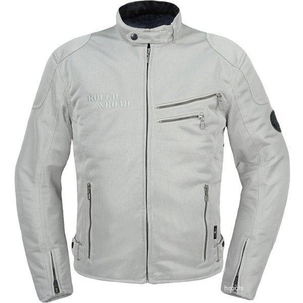 ラフ&ロード 春夏モデル ライディングZIPメッシュジャケットEMカラー:オールシルバーサイズ:L標準装備プロテクター:肩・肘・脊椎パッド取り付け可能プロテクター:胸【素材】表地:スパックスメッシュNEW裏地:スーパーエアメッシュ襟裏:ポリエステル(吸汗・速乾)【仕様説明】ビンテージ感たっぷりでトラディショナルなベースジャケットの背中に個性あるデザイン刺繍を施しました。メイン素材のスパックスメッシュNEWはメッシュ素材にありがちな頼りなさは皆無。厚手にしっかりと編み込まれた特殊用途のメッシュ素材は、軽量ながらしなやかで強く安全性に優れ、夏の行動範囲をグンと広げてくれる手助けとなります。