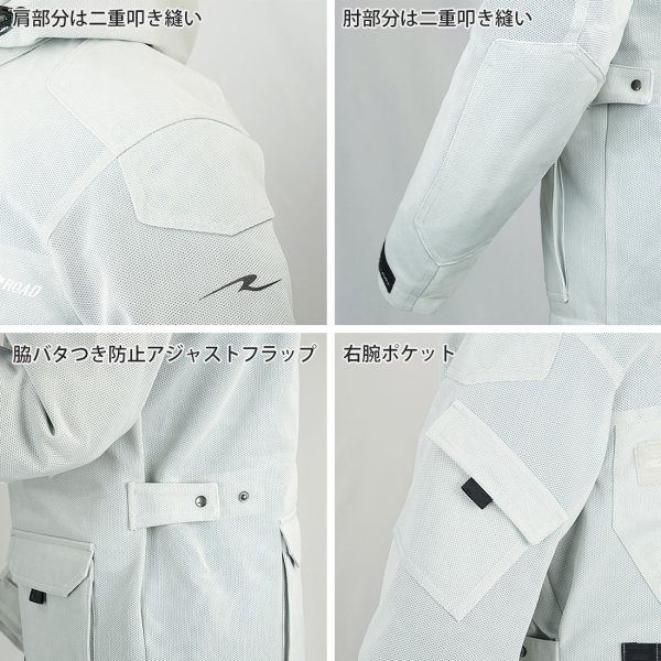 ラフ&ロード 春夏モデル マウンテンメッシュパーカーサイズ:Sカラー:ガンメタ表地:ポリエステル裏地:ポリエステル襟裏:ポリエステル(吸汗・速乾)プロテクター:肩・肘・脊椎パッド付属 (肩・肘はCEパッド) ※胸パッドはオプション圧倒的な通気性と収納に困らない多彩なポケットは、ショート、ロング、キャンプツーリングにもってこいのツーリングメッシュパーカー。圧倒的な通気性を誇る、引き裂き強度に優れたメッシュ生地を採用したミリタリーテイストジャケット。襟裏は吸汗速乾ひんやりアイスタッチ素材により、サラサラ爽快な肌触り。ショート、ロング、キャンプツーリングでも収納に困らない多彩なポケットを装備し、その位置、バランスは、ツーリストの経験から設計、デザインされています。オプションのインナージャケットが装着可能で、寒暖差が心配な朝夕にも対応。酷暑の夏、水分補給に便利な収納式ペットボトルポケットも装備。※生産時期により仕様変更があり商品と画像に差異がある場合がございます。