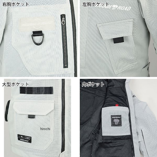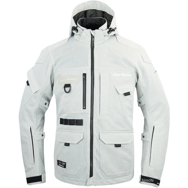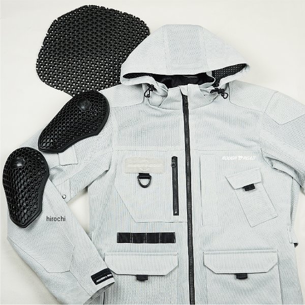 ラフ&ロード 春夏モデル マウンテンメッシュパーカーサイズ:LLカラー:シルバー標準装備プロテクター:肩・肘・脊椎パッド(肩・肘はCEパッド)取付可能プロテクター:胸【素材】表地:ポリエステル裏地:ポリエステル襟裏:ポリエステル(吸汗・速乾)【仕様説明】圧倒的な通気性を誇る、引き裂き強度に優れたメッシュ生地を採用したミリタリーテイストジャケットです。襟裏は吸汗速乾ひんやりアイスタッチ素材により、サラサラ爽快な肌触り。ショート、ロング、キャンプツーリングでも収納に困らない多彩なポケットを装備し、その位置、バランスは、ツーリストの経験から設計、デザインされています。オプションのインナージャケットが装着可能で、寒暖差が心配な朝夕にも対応。酷暑の夏、水分補給に便利な収納式ペットボトルポケットも装備。