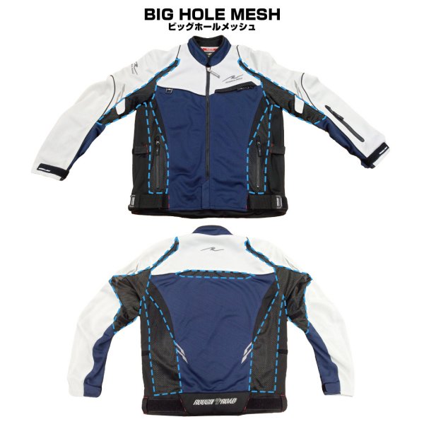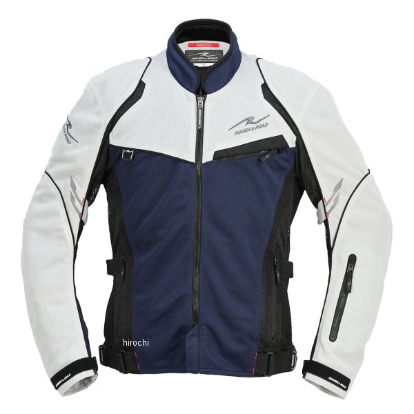 ラフ&ロード 春夏モデル レディース ジェットエアメッシュジャケットFPサイズ:WLカラー:ネイビー表地:ポリエステル(スパックスメッシュ・ビッグホールメッシュ)裏地:ポリエステル襟裏:ポリエステル(吸汗・速乾)プロテクター: 胸・肩・肘・脊椎パッド標準装備より涼しく快適に、動きやすく進化した究極のメッシュジャケット。 いざという時のためのフルプロテクション仕様。スポーツライディングからシティーユースまで幅広くカバーするスピード感あふれるスポーティーなデザイン。肩回りから脇の下、脇腹まで組み合わせた通気性抜群のビッグホールメッシュ採用により、運動性と通気性が大幅に向上。ベース部分は優れた引き裂き強度を持つ立体構造のスパックスメッシュをメイン素材に使用することで、空気の流れを遮ることなく紫外線を効果的に遮断し、真夏の強烈な日差しから肌を守ります。胸・肩・肘・脊椎すべてをガードするフルプロテクションパッドはエアスルータイプで、抜群の通風性を確保しライディングへの集中を妨げず、イザという時にもしっかり備える安心感は他とは一線を画す別次元の仕上がりです。また、オールシーズン対応ファスナー装備で寒いときにはオプションの防風インナーを装着することも可能。女性から体の大きい方まで豊富に揃えたサイズ設定であらゆるニーズに応えます。