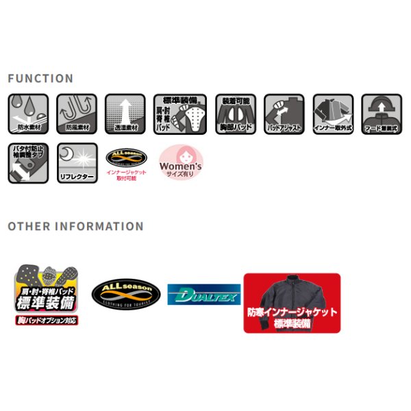 ラフ&ロード 秋冬モデル デュアルテックスウォームパーカー レディースサイズ:WMカラー:TM.ブラック素材:表地 / ナイロンタスランデュアルテックス加工・ナイロンツイルデュアルテックス加工(TMカラーのみ)、裏地 / ナイロンタフタ、インナーJK / ナイロンタフタ70D・起毛トリコット・ウォームマックス(中綿)プロテクター:肩・肘・脊椎パッド標準装備カジュアルなルックスながら、ライディングウエアの基本、肩・肘・脊椎パッドを備えたユーティリティージャケット。時と場所を選ばないデザインは、バイクを離れたシーンでの着こなしにも十分対応し、バイクライフに新たな楽しさが広がります。質感の違う2つの素材を組み合わせたツインマテリアルカラーは装う楽しみを加え、またフードは取り外し可能なため、気分に合せた着こなしが可能。オールシーズン対応ジャケットなので、インナージャケットを取り外し一年を通して着こなせるのもうれしいところ。