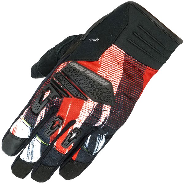 ラフ&ロード 春夏モデル トレイルツーリンググローブサイズ:XLカラー:スクラッチレッド【素材】甲側/ニットジャージ、クロロプレン掌側/牛革、合成皮革【仕様説明】手を握り込んだ自然な形に追従する整形パターンを採用することで薄手のグローブにありがちな手のひら生地の余りを抑えました。ダイレクトな操作感はそのままに要所に配置された縫い目のない溶着シリコンナックルパッドを備え、程よいフィット感とプロテクション性能を両立。雨天や泥汚れが付着しても、グリップ力を損ないにくい微細な起毛処理を施した合成皮革を手のひらに採用しています。内縫いでありながら違和感の少ない指先の縫製にもこだわり、グリップへのアテや転倒時の備えとなるウレタンパームガードも装備。ストレッチ生地で伸びるところは伸び、シリコンパーツやウレタン内蔵で柔軟に守る、ストリートから林道まで幅広いシチュエーションで使えるデュアルパーパスグローブに仕上げました。